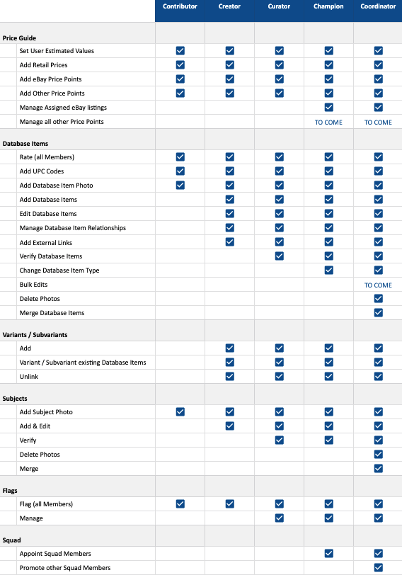 Once a Squad Rookie has completed their training, they can become a full-fledged Squad member with the Contributor role. In addition to the abilities they had as a Rookie, Contributors can add other types of Price Points, join the Squad community on Facebook, and receive a discount on hobbyDB Marketplace seller fees!